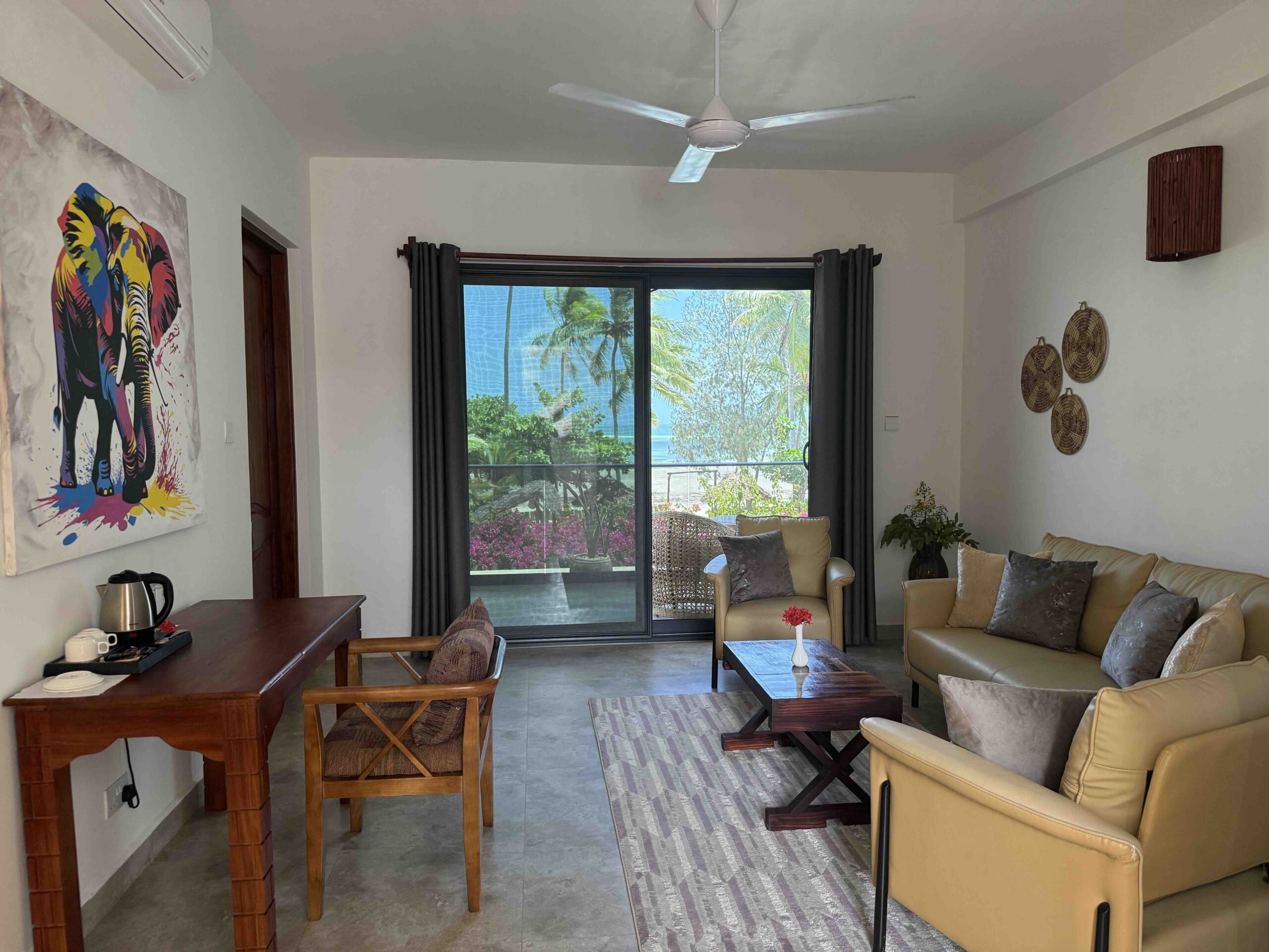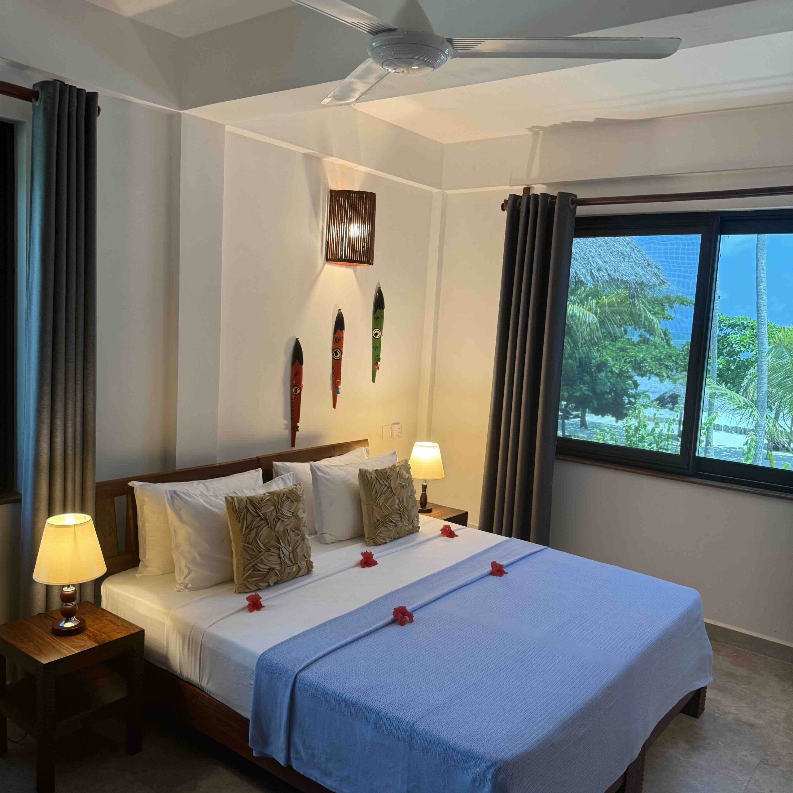 This comfortable suite impresses with a fantastic view of the Indian Ocean. It has a balcony with high-quality glass railings. Guests enjoy the incredible view and atmosphere as the sun rises over the ocean horizon or the light reflections on the sea at night.